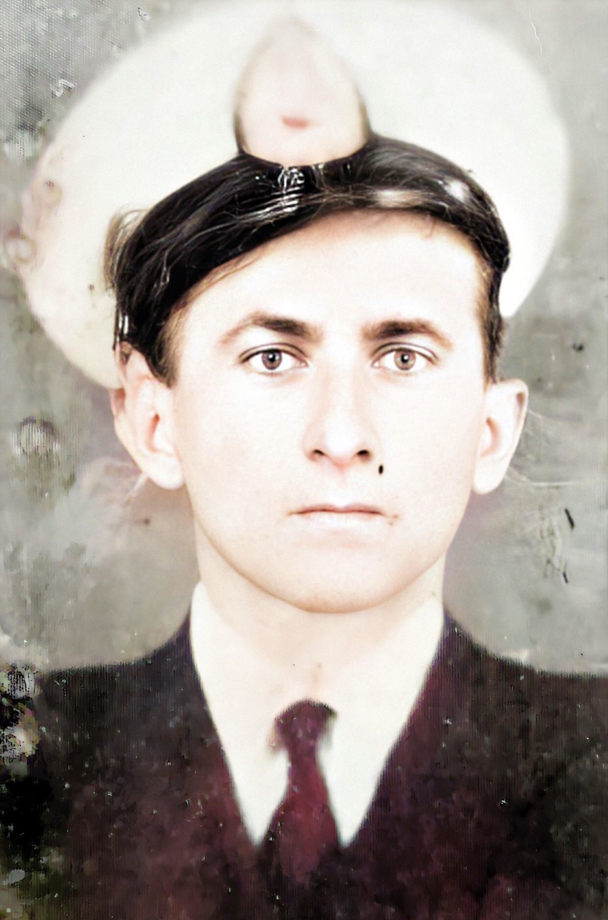 Adoro este retrato do meu avô tirado em 1937, quando ele tinha 24 anos. Eu encontrei a versão ampliada em preto e branco que costumava ser emoldurada com a foto da minha avó ao lado da dele como um retrato de anúncio de casamento. As cópias emolduradas eram colorizadas. Eu também adoro a forma como MyHeritage trouxe à vida a foto dele! Experimente também e fique maravilhado.